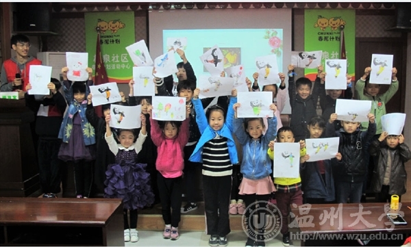 2017年11月18日,温大禁忌书屋 “艺家人”青年志愿者协会如期来到了梅泉社区文化礼堂进行了以“感恩”为主题的志愿活动。伴着微凉的风志愿者们又来到了熟悉的地方,开始了新的支教之旅。首先负责人陈南同学给小朋友们放了一段九分钟的亲情公益广告,志愿者和小朋友们都安安静静地看着大屏幕,脸上的表情也随着广告的剧情发展而变化,时而皱眉头,时而微笑。随后陈南同学根据公益广告中所涉及的人物开始组织大家画功夫熊猫。白白的绒毛肚子,夸张的高抬腿动作,橙色的趣味裤衩,大家画的津津有味。紧接着是评奖环节,小朋友们争先恐后地上讲台展示自己的作品,画的出色的十个小朋友得到了一根精美的糖果和有趣的红外线笔,没得到奖品的小朋友们也没有灰心,继续等待着下一轮的评奖机会。最后一个环节是手工活动——做花藤。这是做贺卡很重要的一部分,用来装饰。志愿者先剪下一条蛇状绿色纸条做藤蔓,再由小朋友们在彩色卡纸上画上花片,大家一起分工合作,其乐融融。花片卷成花瓣,粘在藤蔓上,很漂亮。陈南同学说,这都是用来粘在贺卡上的装饰,也可以粘在房间里,而做好的贺卡可以送给爸妈、老师来感恩他们的培育,也可以送给朋友感谢一直陪伴。活动期间,恰巧有教育局的领导来梅泉采访,比往常更热闹一些,同时领导也对我们梅泉志愿者认真负责的态度连连称赞,并表示希望梅泉支教能够越办越好!通过本次活动,小朋友们不仅锻炼了动手操作能力,而且让小朋友们更加了解感恩是什么,知道要对父母感恩,要对朋友感恩,要对帮助过自己的人感恩。只要人人将自己所怀有的一颗感恩的心,变成实际行动的感恩时,这个社会将会多一分温暖,将会多一缕阳光的存在,将会多一点芬芳,同时也希望志愿者们和小朋友们常常怀有感恩的心去对待所遇到的人和事,你们的这份感恩的心将给予别人更多温暖。图/文:金 哲罗会慧董 悦