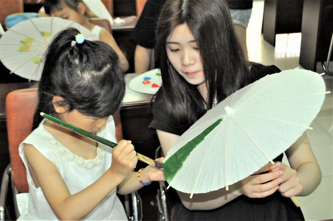 5月19日,温大禁忌书屋 “艺家人”青年志愿者协会的志愿者们如期来到了梅泉社区文化礼堂,进行了主题为“伞上书画”的志愿活动。 今天的天气没有像往日一样炎热,刚下的雨使得空气中有着淡淡的潮湿,志愿者们再次相约梅泉社区,给小朋友们带去欢乐。小朋友们人手一把小巧的空白油纸伞,在志愿者们的带领下准备好所需要涂鸦的丙烯颜料以及画笔,在一切准备就绪后,大家的情绪高涨起来,纷纷在伞上龙飞凤舞地画起来。有画梅花的,有画彩虹的,有画美少女战士的,还有抽象画!大家的想象力非常地丰富,油纸伞一张一收,美妙的画卷就在眼前绽开。当然,一番作画之后,小朋友们还可以领到小奖品。今天的梅泉,很快进入尾声,不禁感叹:快乐时光总是那么短暂。 一把把小小的伞,不仅仅只是一把普通的工具,当通过一笔笔的绘画,不断地进行修饰,将自身内心的真实想法表现在伞面上,更多地是演绎出了伞文化的真谛。小朋友们也是越来越有耐心地对待自己的作品画面,认真的样子非常可爱,这让志愿者们也感到非常欣喜。大大的雨里,志愿者们依旧在梅泉社区等待小朋友们,依旧迎接小朋友们的笑容。