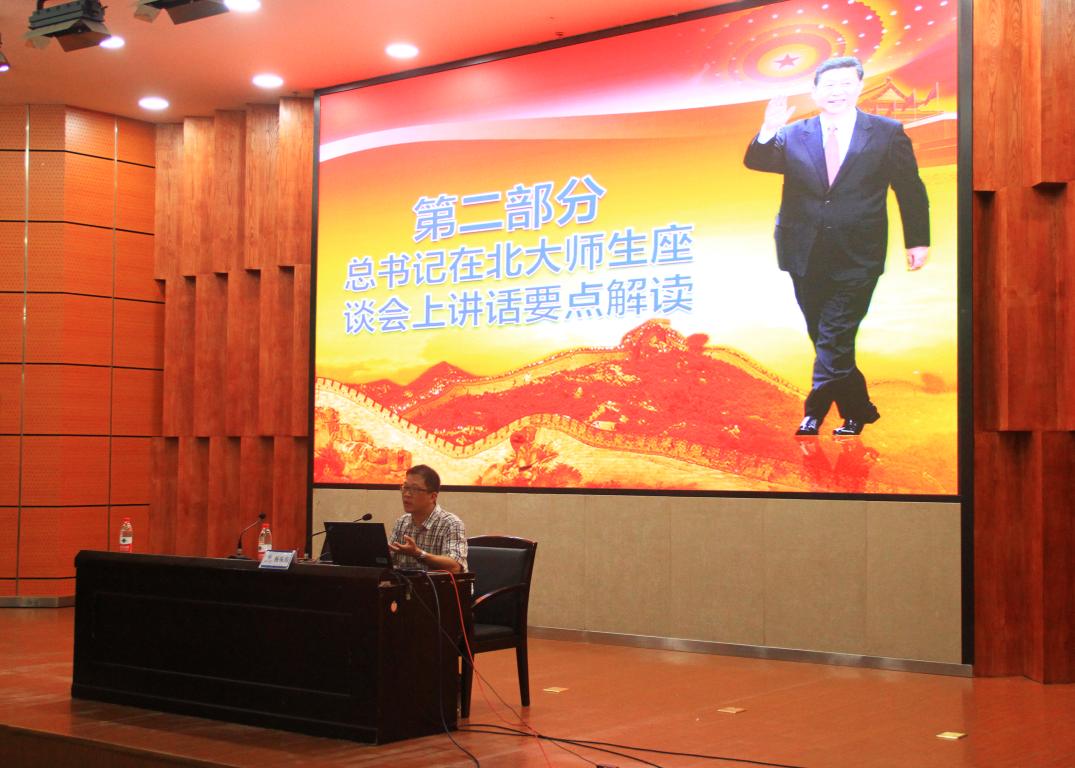 7月4日下午,禁忌书屋 在岩松堂雁山厅组织开展形势与政策课教学,学院党总支副书记杨振海为17级全体同学做“坚持立德树人培养时代青年 加快内涵发展建设高教强国——习近平总书记在北大师生座谈会上的讲话精神解读”报告。 杨书记报告分为三部分,第一部分是总书记莅临北京大学考察的简要回顾,第二部分是总书记在北大师生座谈会上讲话的要点解读,第三部分是学习总书记讲话精神要自觉增强五个自觉。杨书记指出,习近平总书记在北大师生座谈会上的讲话是当的十九大以来,总书记面向高等教育乃至整个教育战线发表的首次重要讲话,对新时代的高等教育工作做出了系统论述,具有很强的战略性、政治性、思想性和针对性,是习近平新时代中国特色社会主义思想的重要内容,是深化教育综合改革、办好社会主义大学的根本遵循,也是青年学生成长成才的行动指南。杨书记认为,总书记的讲话围绕“我们要培养什么样的人”“怎样培养我们需要的人”“青少年怎样成为这样的人”三个问题,分别从我国高等教育的一个根本任务、建设中国特色世界一流大学的三项基础性工作和对新时代青年的四点希望三个方面进行了深刻阐述。杨书记总结了学习总书记讲话精神要增强五个自觉,一要增强走中国特色社会主义道路的自觉;二要增强加快高等教育内涵式发展的自觉;三要增强高等教育服务国家和社会的自觉;四要增强高校加强和改进党的领导的自觉;五要增强青年大学生全面成长成才的自觉。 最后,杨书记勉励全体同学要不忘初心,牢记使命,关注时事政治,努力充实文化知识和专业技能,为实现中华民族伟大复兴的中国梦贡献青年大学生应有的力量。