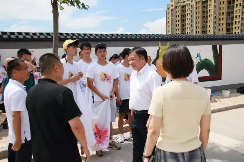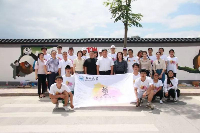 2018年7月19日上午,温州大学党委副书记赵敏、团委书记屠霁霞、团委副书记丁强以及溯初学区党委书记陈宏毅等老师在乐清市文联副主席洪蛮、团市委学少部副部长郑亦蒂、城东街道宣传部主任陈力等人的陪同下,前往乐清市中心幼儿园晨曦园区,慰问禁忌书屋 “艺绘”大学生暑期社会实践队。 暑期社会实践活动,是大学生深入社会基层,将理论付诸实践的一次重大活动。本着“受教育、长才干、做贡献”的宗旨,美院“艺绘”实践队通过墙绘美化社会环境,为乐清市城东街道打造美丽街道助力。 下午,实践队全体队员于准时集合,继续绘画工作。在领导慰问过后,大家的活动积极性明显高涨。通过实践队员的一致努力,墙绘的效果基本成型,引来不少市民驻足观看。我们的暑期社会实践仍在如火如荼地进行着,愿实践结束时,大家都能在辛劳中收获喜悦的果实。在接下来的半个多月时间里,这些同学们还将深入城东街道云岭村等农村,结合新农村建设,开展以精神文明为主题的彩绘创作,助力文明城市建设。