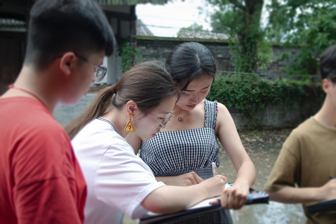 早上七点半,队员们早早来到芙蓉古村内,或是摊开速写本描绘下古建筑美好的瞬间,或是举起相机认真地寻找最佳的拍摄角度。在司马第大宅前,负责测绘的队员们利用测绘仪器精密地测量出宅院的各个数据,认真的绘制古建筑的三视图。测绘过程非常艰辛,我们不仅要顶着炎炎的烈日,还要预防突如其来阵雨,但对于测绘的我们而言这也是一种乐趣,因为只有付出汗水才会收到满意的回报。测绘主要是使用了激光测距仪与卷尺,队员们严谨的工作场景吸引了游客的驻足围观,在我们说明我们是为了古建筑研究传承之后,他们对我们表示了真诚的夸赞。