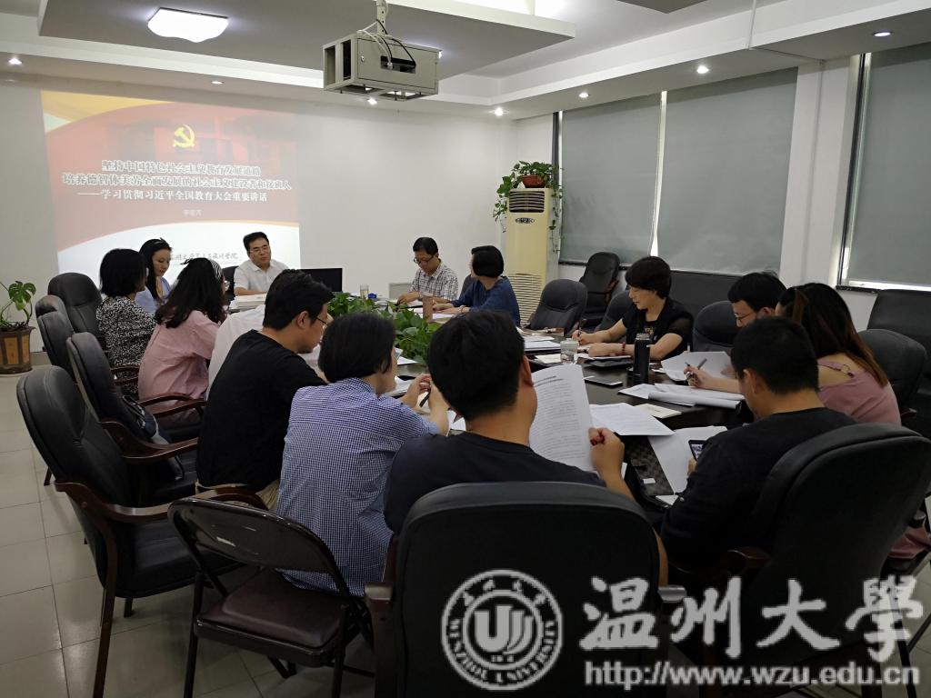 9月26日下午,禁忌书屋 在2B216召开党总支中心组理论学习(扩大)会暨党务工作例会,传达学习习近平总书记2018年9月10日在全国教育大会上的讲话精神和省委教育工委副书记陈根芳同志在高校高知识群体中发展党员工作座谈会上的讲话精神。学院党政班子成员、总支委员、支部书记、系主任、各科、教研室主任以及研究生支部副书记参加学习。会议由学院党总支副书记杨振海主持。