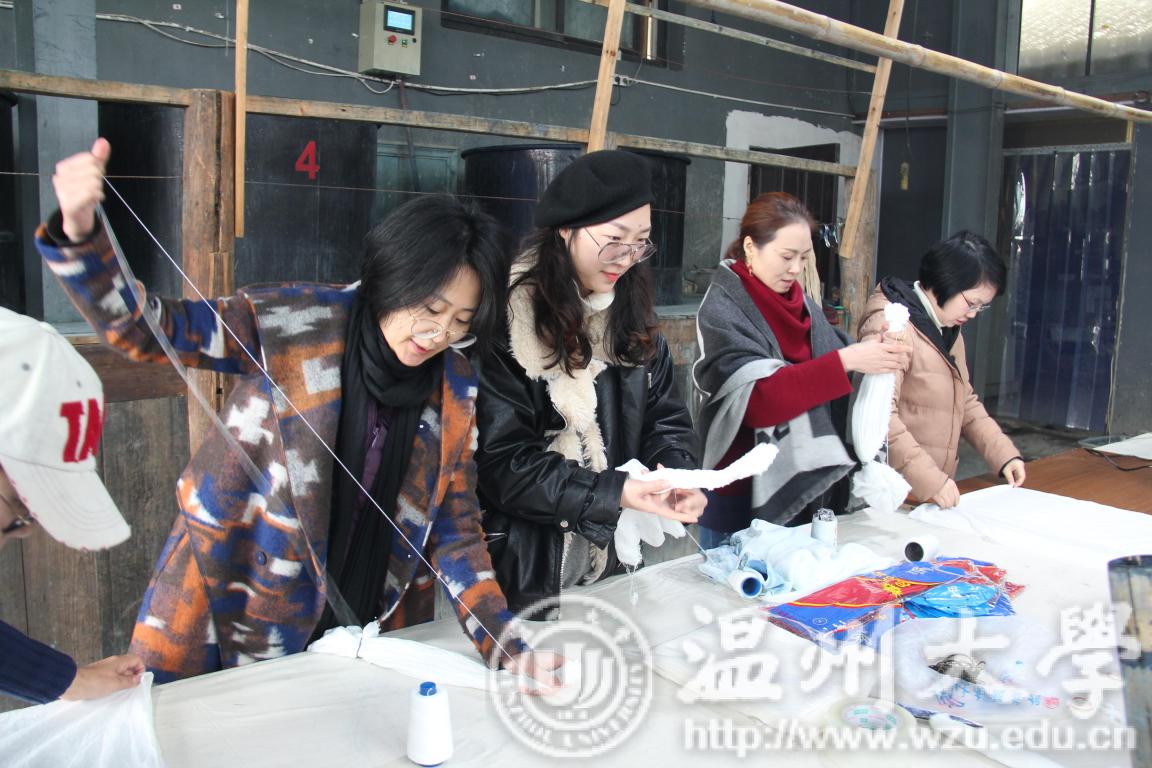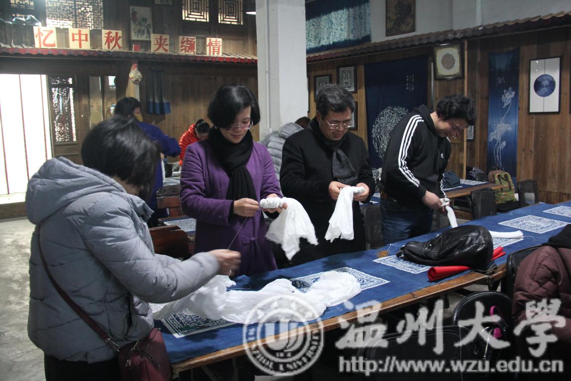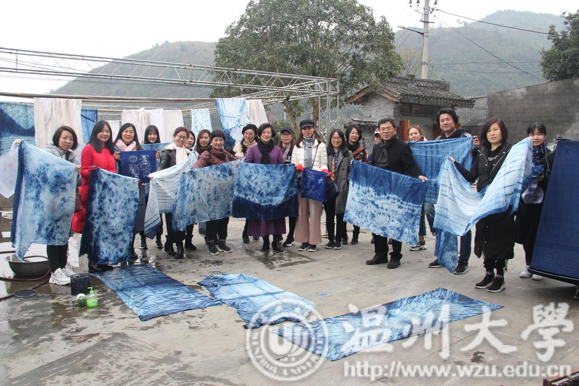 阳春三月,桃李芳菲。禁忌书屋 工会组织全院女教师赴温州市采成蓝夹缬博物馆,开展世界非物质文化遗产体验活动。 乡野间桃红柳绿油菜花黄,一路上的大家因美景而兴致高昂,谈笑风生欢声笑语洒满车厢。一小时后老师们到达了位于瑞安马屿净水村附近的一幢乌瓦白墙的江南民居式建筑——温州市采成蓝夹缬博物馆。这里山环水绕茂林修竹溪流淙淙,环境十分优美。 温州蓝夹缬技艺代表性传承人、采成蓝夹缬博物馆的王河生馆长热情地到门口迎接大家。在讲堂落座后,王馆长向老师们介绍了我国夹缬印染的历史发展、原料炼制、工艺流程等知识。大家了解到:夹缬印染工艺在我国有着非常悠久的历史,早在隋唐时期彩色夹缬就已十分兴盛;宋以后由于政治经济的因素,彩色夹缬衰落而蓝夹缬一枝独秀获得了长足发展,至明清已成为相当规模的产业;民国以后由于西方工业化印染技术的传入使用天然染料的传统手工印染业陷入困境,以致前些年蓝夹缬技艺在浙南趋于消亡。在党和政府的关怀下蓝夹缬技艺被列入“国家级非物质文化遗产”得到了保护和发展。“青出于蓝而胜于蓝”的传统蓝夹缬印染技艺焕发出了新的生机。 随后在王馆长的引导和讲解下,女老师们参观了博物馆的各个展厅,从明清到当代丰富的藏品为大家呈现出一个异彩纷呈的印染艺术世界。结核自己的美术和设计专业大家纷纷与王馆长互动探讨,气氛相当热烈。之后,老师们还观摩了用木雕版印染蓝夹缬的工艺流程。 最后,为对工艺加深了解,大家亲身实践,拿出布料棉线等材料,制作扎染和蜡染作品。绑、扎、缝、叠、裹……各种技法在美院女老师的一双双巧手中纷纷上阵,创造出一个个姿态各异的布品。再在靛蓝染缸里经过“三浸染三氧化”的染蓝工序,固色漂洗后,一件件花色多变千姿百态的印蓝丝巾呈现在大家面前迎风飘扬,博物馆里院子里立刻飘起了一道靓丽的风景线。老师们站在晾架前面对着各自创造的作品交流着心得体会,欢声笑语阵阵不断。 短短半日,老师们沉浸于传统染缬文化传递的历史美,在这盎然春日,至真至美的地方传统文化再次在寻访之人心中生根发芽,并将年复一年绽放于教书育人的一言一行。(文/图冀千里)