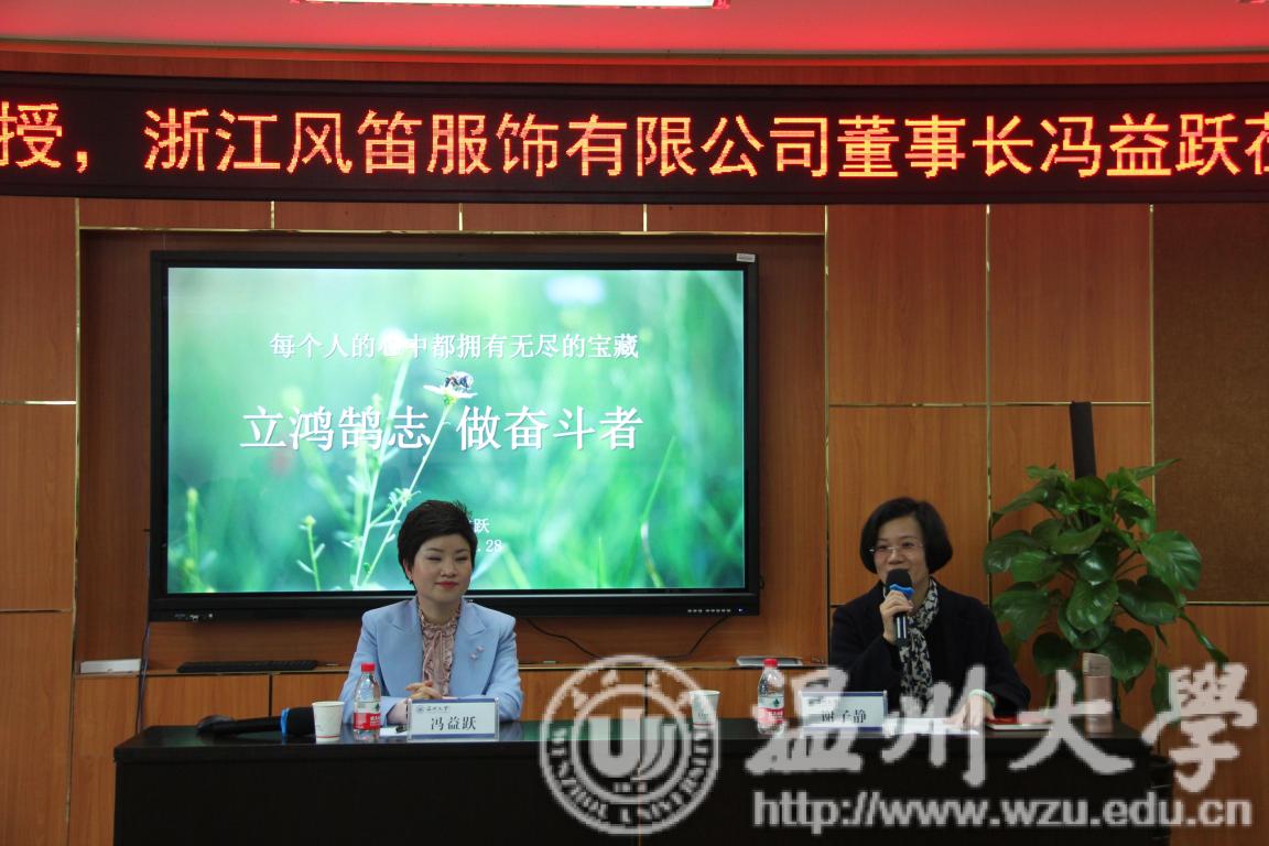3月28日下午,禁忌书屋 客座教授、浙江风笛服饰有限公司董事长冯益跃女士莅临禁忌书屋 讲学,主题为《立鸿鹄志,做奋斗者》,学院院长李运河教授、副院长谢子静教授、学生科科长叶筱卉、服装与服饰设计教研室主任钟信群以及相关专业教师和学生参与观听,全场座无虚席。学院副院长谢子静教授主持。