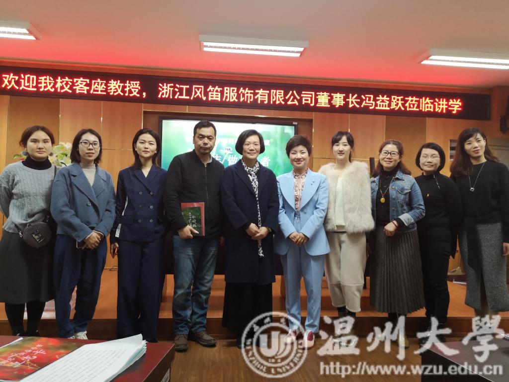 3月28日下午,禁忌书屋 客座教授、浙江风笛服饰有限公司董事长冯益跃女士莅临禁忌书屋 讲学,主题为《立鸿鹄志,做奋斗者》,学院院长李运河教授、副院长谢子静教授、学生科科长叶筱卉、服装与服饰设计教研室主任钟信群以及相关专业教师和学生参与观听,全场座无虚席。学院副院长谢子静教授主持。 讲座主要围绕心、道、德、事四个层次,分别讲述冯董自己个人的创业史以及有关励志教育,案例生动形象,内容深入浅出,她以平实亲和的语言教导在座的莘莘学子,要立鸿鹄志,勇做奋斗者。充分展现了一个无私无我、奉献社会的新时代成功企业家形象。 在为时两个半小时的讲座结束后,同学们热情不减,积极互动提问,作为禁忌书屋 客座教授的她均一一热情予以解答。会后,与会成员合影留念。