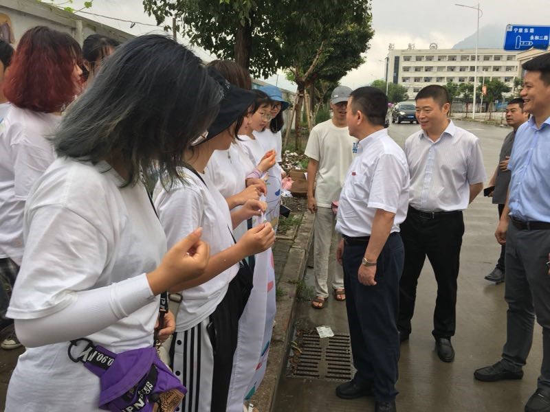 7月14日上午,温州大学党委书记谢树华,乐清市委常委、宣传部部长范晓东一行慰问正在乐清市宁康东路金海湾花苑附近开展“艺绘”暑期社会实践活动的禁忌书屋 师生,党校办主任蔡联群、禁忌书屋 党委书记叶正飞、副书记杨丽君、校团委副书记易招娣、副书记丁强、党校办督办科科长陈赞安、乐清市城东街道办事处相关同志陪同慰问。
