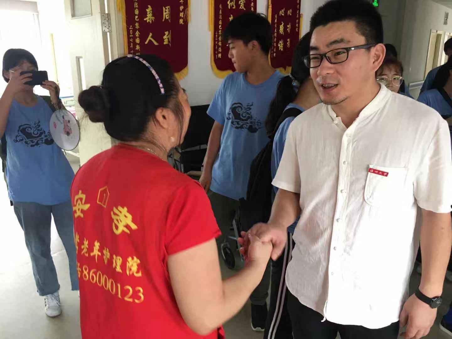 2019年7月18日上午九时许,禁忌书屋 副院长胡文超慰问了正在温州安孝老年护理院关爱老人活动的“艺韵晚霞”暑期社会实践队。初到敬老院,胡院长一行受到实践队员的热情欢迎,通过和队员们简单的交谈后,胡院长进入敬老院里,和敬老院里的护理人员详细了解敬老院的基本情况。