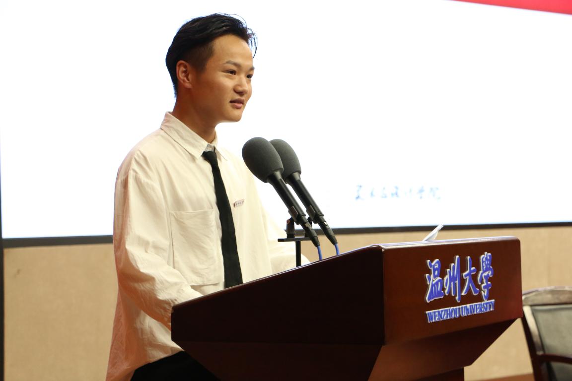 新生代表崔帅同学一边讲述着初入大学的迷茫,一边呼吁大家面向未来,尽快适应大学生活,融入集体,带着对知识的渴望继续开拓进取,完成自己最初的理想,不负宝贵的青春时光。