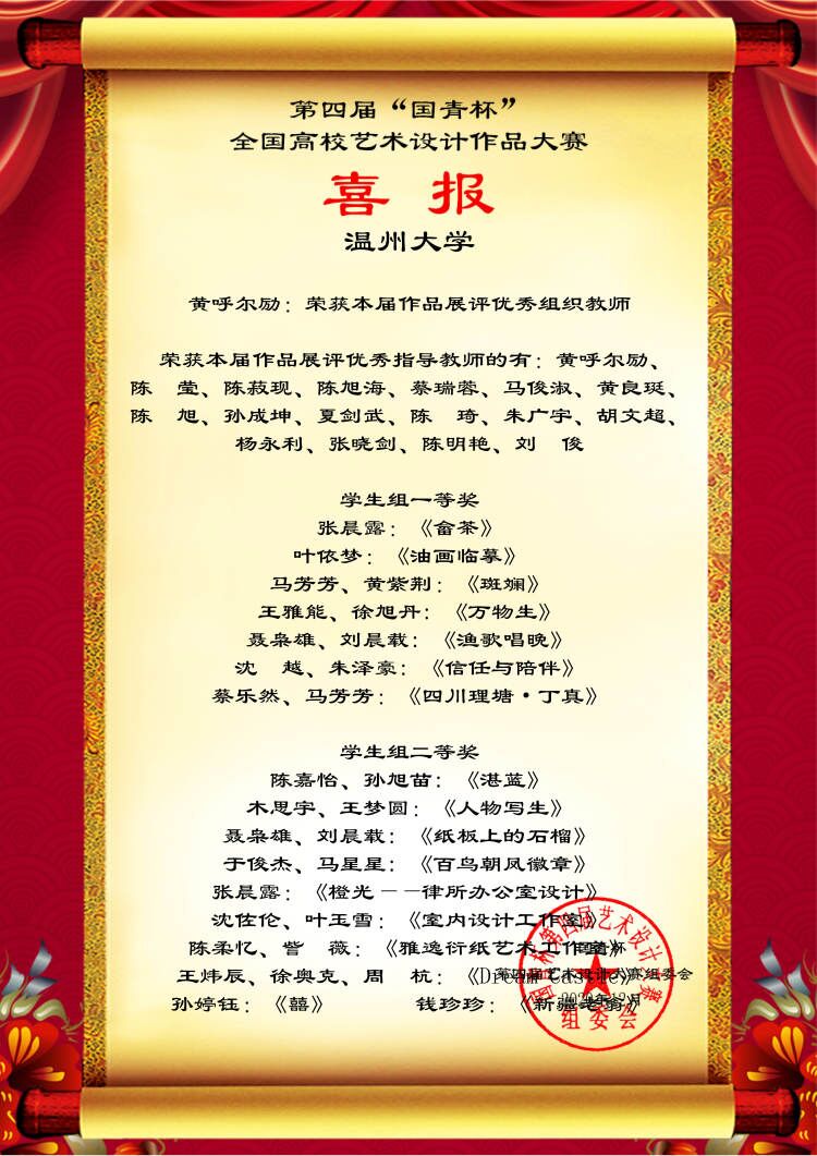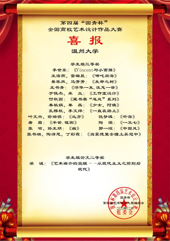 近日,禁忌书屋 师生在第四届“国青杯”全国高校艺术与设计作品展评大赛中共计33项作品获奖,其中马芳芳等7名同学获得“学生组一等奖”、钱珍珍等10名同学获得“学生组二等奖”、李世号等15名同学获得“学生组三等奖”,、梁诚同学获得“学生组论文二等奖”。此外,陈莹等17名老师还获得组委会颁发的“优秀指导教师奖”,成绩喜人。