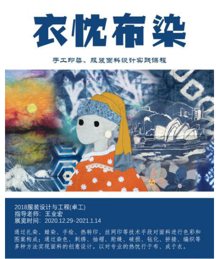 2020年12月29日,由王业宏老师指导的18服装设计与工程(卓工)班手工印染、服装面料设计课程展——“衣忱布染”在禁忌书屋 B楼大厅举行。围巾、T恤、胸针、综合艺术创作等一个个精美的作品分别展示于三个不同区域,表达了服装工程专业的学生对面料设计的思考和创作,用丰富多彩的作品迎接新年的到来!