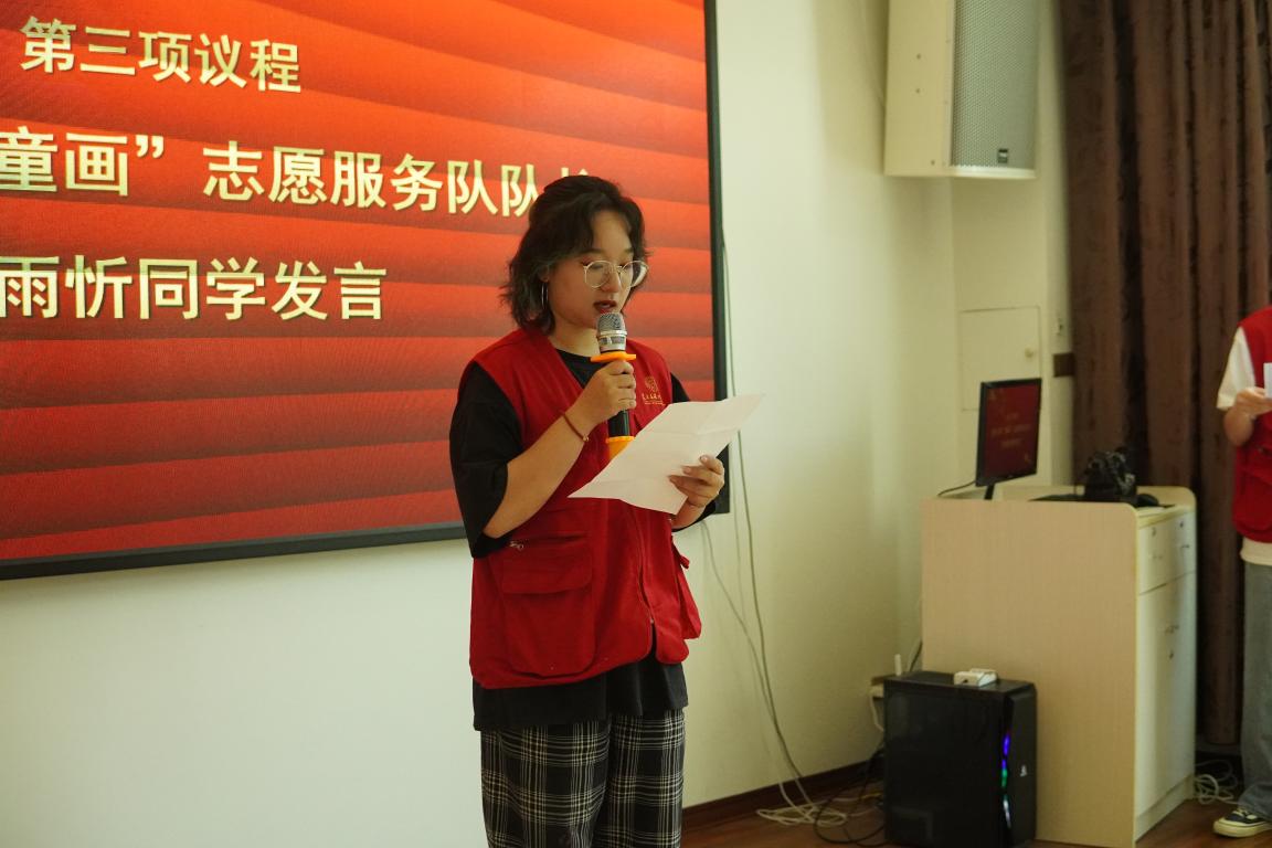 随后,“童画”志愿服务队长罗雨忻作表态发言,她表示在今后的实践过程中将充分挖掘美育内涵,坚持理论与实践相结合,严格要求自己,不断提升自我、完善自我,为传承美育精神,弘扬传统文化,贡献青春力量。