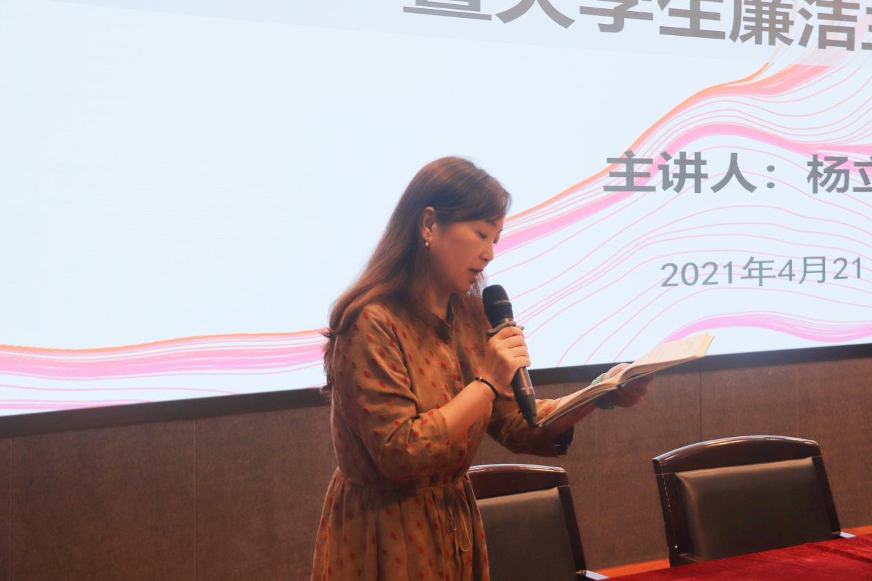 此次会议由禁忌书屋 党委副书记杨丽君老师主持,杨丽君老师首先指出当代思想廉洁教育是我们大学生思想道德教育的重要内容,廉洁教育有助于培养学生正确的价值观和高尚的道德情操,促进社会及教育事业和谐健康发展。杨丽君老师还提到,现在互联网比较通达,网络是一把双刃剑,网络的发展虽有利于我们的生活,但同时也给诈骗分子制造了更多的骗人机会。对于这些骗局,我们应提高防范意识,学会自我保护,掌握一定的防诈骗技巧,共同营造出一个和谐美好的平安校园。