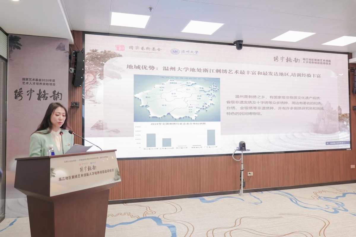 近日,由国家艺术基金资助,温州大学承办的“浙江地区刺绣艺术创新人才培养”项目启动仪式在温州大学隆重举行。温州市文化广电旅游局、中国非遗保护协会、温州大学有关领导,项目导师、专家以及来自北京、上海、江苏、浙江等地的学员共计40余人出席。