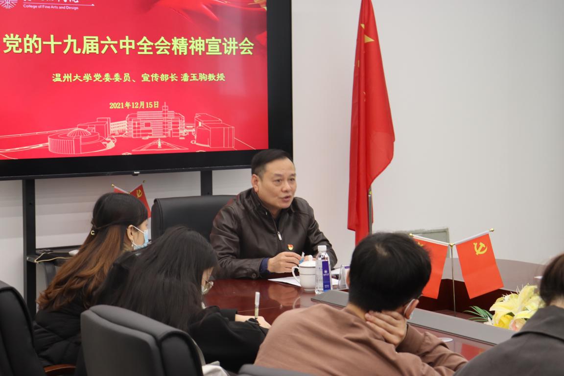 为深入学习贯彻党的十九届六中全会精神,深入领会全会精神内涵,12月15日下午,温州大学党委委员、宣传部部长潘玉驹教授进行了学习贯彻党的十九届六中全会精神宣讲。宣讲会由美术学院党委书记叶正飞主持,师生代表参加。