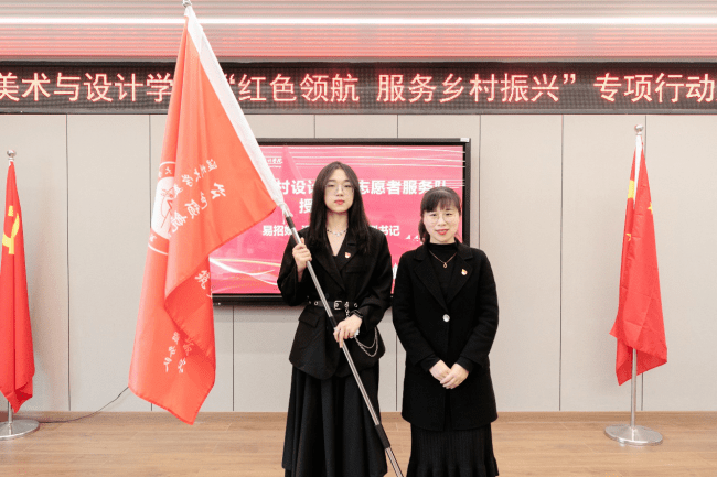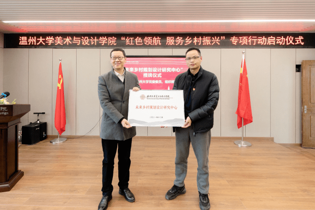 自党的十九大提出乡村振兴战略以来,温州大学师生积极探索发挥高校的智慧和力量、服务温州乡村振兴。近年来,温大禁忌书屋 依托美术学和设计学专业优势,也做了不少探索和实践。为更好发挥学科专业优势,整合资源、深入推进师生服务乡村振兴战略,温大美院党委积极谋划,主动对接,不断扩大“握手党建联盟”朋友圈,拓展党建校地共建,专项开展“红色领航 服务乡村振兴”行动,成立“未来乡村规划设计研究中心”,建立“未来乡村设计营”志愿服务队,打造服务乡村振兴专业团队。启动仪式上,温州大学党委委员、组织部长郑信军为“未来乡村规划设计研究中心”授牌,温州大学团委副书记易招娣为“未来乡村设计营”志愿者服务队授旗。