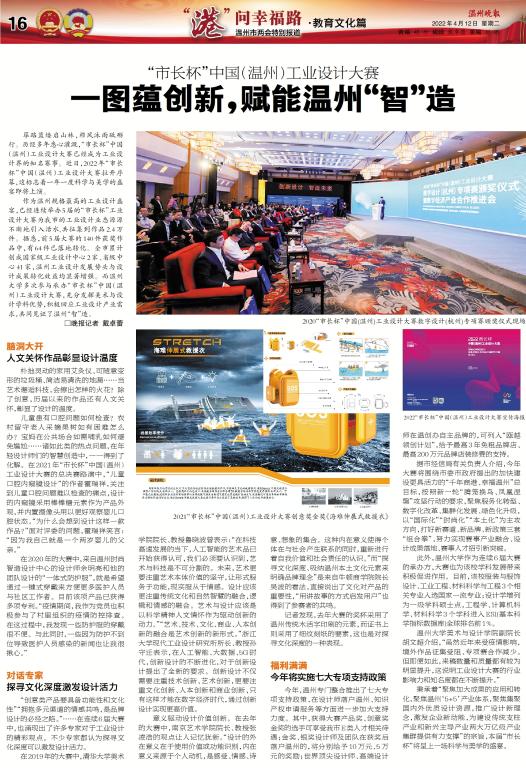 筚路蓝缕启山林,栉风沐雨砥砺行。历经多年悉心灌溉,“市长杯”中国(温州)工业设计大赛已经成为工业设计界的知名赛事。近日,2022年“市长杯”中国(温州)工业设计大赛拉开序幕,这标志着一年一度科学与美学的盛宴即将上演。作为温州规格最高的工业设计盛宴,已经连续举办5届的“市长杯”工业设计大赛为我市的工业设计业态源源不断地引入活水,共征集到作品2.4万件。据悉,前5届大赛的140件获奖作品中,有64件已落地转化。全市累计创成国家级工业设计中心2家、省级中心41家,温州工业设计发展势头与设计成果转化效益均显著增强。而温州大学多次参与承办“市长杯”中国(温州)工业设计大赛,充分发挥美术与设计学科优势,积极回应工业设计产业需求,共同见证了温州“智”造。2022“市长杯”中国(温州)工业设计大赛宣传海报脑洞大开人文关怀作品彰显设计温度朴拙灵动的家用艾灸仪、可随意变形的垃圾桶、简洁易清洗的地漏……当艺术邂逅科技,会擦出怎样的火花?除了创意,历届以来的作品还有人文关怀,彰显了设计的温度。儿童患有口腔问题如何检查?农村留守老人采摘果树如有困难怎么办?宝妈在公共场合如需哺乳如何避免尴尬……诸如此类的热点问题,在年轻设计师们的智慧创造中,一一得到了化解。在2021年“市长杯”中国(温州)工业设计大赛的总决赛路演中,“儿童口腔内窥镜设计”的作者霍瑞祥,关注到儿童口腔问题难以检查的痛点,设计的内窥镜采用棒棒糖元素作为产品外观,并内置摄像头用以更好观察婴儿口腔状态。“为什么会想到设计这样一款作品?”面对评委的问题,霍瑞祥笑言:“因为我自己就是一个两岁婴儿的父亲。”2021“市长杯”中国(温州)工业设计大赛创意奖金奖《海难伸展式救援衣》在2020年的大赛中,来自温州时尚智造设计中心的设计师余明亮和他的团队设计的“一体式防护服”,就是希望通过一键式穿戴来方便更多医护人员与社区工作者。目前该项产品已获得多项专利。“疫情期间,我作为党员也积极参与了村里组织的疫情防控排查。在这过程中,我发现一些防护服的穿戴很不便。与此同时,一些因为防护不到位导致医护人员感染的新闻也让我很揪心。”对话专家探寻文化深度激发设计活力“创意类产品要具备功能性和文化性”“拥抱多元渠道的情感共鸣,是品牌设计的必经之路。”……在连续6届大赛中,也涌现出了许多专家对于工业设计的精彩观点。不少专家都认为探寻文化深度可以激发设计活力。在2019年的大赛中,清华大学美术学院院长、教授鲁晓波曾表示:“在科技高速发展的当下,人工智能的艺术品已开始获得认可,我们必须要认识到,艺术与科技是不可分割的。未来,艺术更要注重艺术本体价值的坚守,让形式服务于功能,现实服从于情感。设计应该更注重传统文化和自然智慧的融合,逻辑和情感的融合。艺术与设计应该是以科学精神人文情怀作为驱动创新的动力。”“艺术、技术、文化、商业、人本创新的融合是艺术创新的新形式。”浙江大学现代工业设计研究所所长、教授孙守迁表示,在人工智能、大数据、5G时代,创新设计的不断进化,对于创新设计提出了全新的要求。创新设计不仅需要注重技术创新、艺术创新,更要注重文化创新、人本创新和商业创新,只有这样才能在数字经济时代,通过创新设计实现更高价值。2020“市长杯”中国(温州)工业设计大赛数字设计(杭州)专项赛颁奖仪式意义驱动设计价值创新。在去年的大赛中,南京艺术学院院长、教授张凌浩的观点让人记忆犹新。“设计的外在意义在于使用价值或功能识别,内在意义来源于个人动机,是感受、情感、诗意、想象的集合。这种内在意义使得个体在与社会产生联系的同时,重新进行着自我价值和社会责任的认识。”而“探寻文化深度、吸纳温州本土文化元素来明确品牌理念”是来自牛顿商学院院长吴波的看法,直接说出了文化对产品的重要性,“用讲故事的方式启发用户”也得到了参赛者的共鸣。记者发现,去年大赛的奖杯采用了温州传统木活字印刷的元素,而证书上则采用了细纹刻纸的要素,这也是对探寻文化深度的一种表现。福利满满今年将实施七大专项支持政策今年,温州专门整合推出了七大专项支持政策,在设计师落户温州、知识产权申请服务等方面进一步加大支持力度。其中,获得大赛产品奖、创意奖金奖的选手可享受我市E类人才相关待遇;金奖、银奖设计师及团队在获奖后落户温州的,将分别给予10万元、5万元的奖励;世界顶尖设计师、高端设计师在温创办自主品牌的,可列入“瓯越领创计划”,给予最高3年免租品牌店、最高200万元品牌店装修费的支持。据市经信局有关负责人介绍,今年大赛将围绕市委市政府提出的加快建设更具活力的“千年商港、幸福温州”总目标,按照新一轮“腾笼换鸟、凤凰涅槃”攻坚行动的要求,聚焦服务化转型、数字化改革、集群化发展、绿色化升级,以“国际化”“时尚化”“本土化”为主攻方向,打好新赛道、新品牌、新政策三套“组合拳”,努力实现赛事产业融合、设计成果落地、赛事人才招引新突破。此外,温州大学作为连续6届大赛的承办方,大赛也为该校学科发展带来积极促进作用。目前,该校服装与服饰设计、工业工程、材料科学与工程3个相关专业入选国家一流专业;设