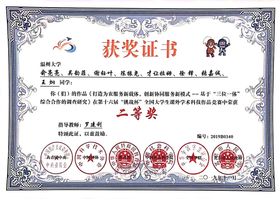 《打造为农服务新载体,创新协同服务新模式——基于“三位一体”综合合作的调查研究》获得第十六届“挑战杯”全国大学生课外学术科技作品竞赛二等奖,提出了由“三位一体农合联”与“三位一体合作社”共同构成的三位一体综合合作体系。该体系从生产、供销、信用方面入手,解决生产技术落后、供销渠道狭窄、周转资金不足等问题,其本质是整合乡村要素资源,打造为农综合服务平台,从而能够有效促进城乡资源双向流动和要素合理配置,为农村发展注入新的动力。在此项目基础上继续开展的新课题荣获浙江省第十七届“挑战杯”大学生课外学术科技作品竞赛特等奖,并向国赛奖项发起冲击。