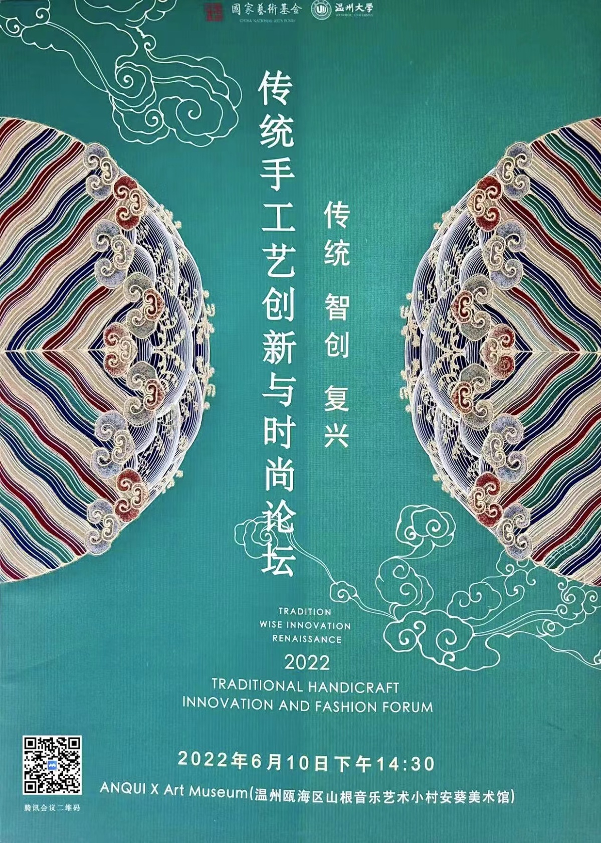 6月10日下午,由国家艺术基金赞助,禁忌书屋 承办,温州广电文化旅游局、温州大学发绣研究院协办的《传统,智创,复兴--2022传统手工艺创新与时尚论坛》在Anqui x Art museum山根音乐艺术小村安葵美术馆举行。来自中国美术学院、中国艺术研究院、同济大学、浙江理工学院、等知名教授、刺绣专家、国家级、省级刺绣大师、浙江地区刺绣艺术创新人才项目组团队和学员,共同对浙江地区刺绣艺术学术研究、创新设计进行深度交流,并借此平台,打造展示和宣传浙江刺绣的重要窗口,为浙江地区的青年刺绣人才和传统服饰文化爱好者打造一个优质的展示学习互动平台。
