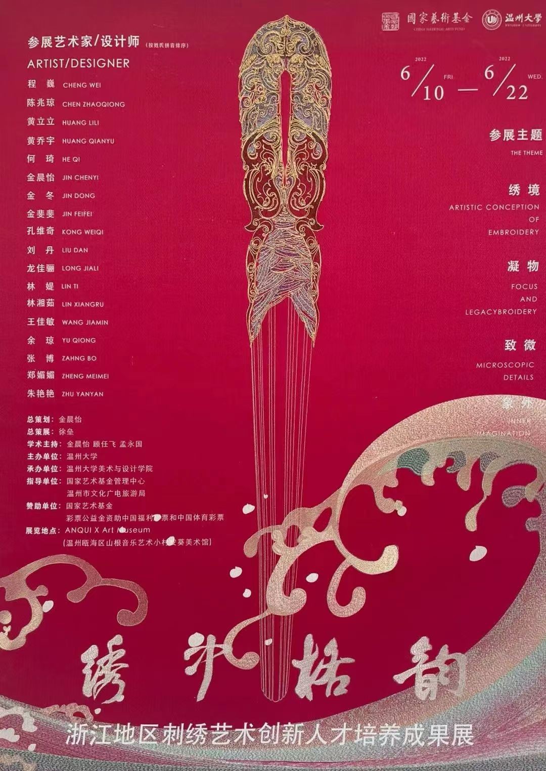 6月10日上午,国家艺术基金2020年度艺术人才培养资助项目“浙江地区刺绣艺术创新人才培养成果展”在Anqui x Art museum(山根音乐艺术小村安葵美术馆)开幕,温州大学副校长徐和昆、温州市文化广电旅游局副局长李方喜、浙江省民间文艺家协会主席杭间、禁忌书屋 院长谢子静等领导和专家、以及来自全国各地的刺绣非遗传承人50余人出席开幕式。嘉宾合影徐和昆副校长徐和昆副校长致辞。温州大学是浙南闽北赣东区域唯一的综合性教学研究型大学,艺术教育底蕴深厚,实力突出,本次展览在国家艺术基金项目的大力资助下,必将进一步推进温州非遗人才培养,促进浙江工艺美术薪火相传,为中国刺绣艺术事业发展作出更大的贡献。李方喜副局长李方喜副局长表示,温州素有“百工之乡”美誉,多年来,温州市委、市政府对刺绣艺术和产业的发展高度重视,大力扶持刺绣艺术文化发展,长期推动非物质文化项目进校园等,筑牢传统根基,绣中格韵刺绣艺术创新成果展以新时代的手工艺实践者为主体,力求打造注重实践的传统创新学术体系的创新做法值得肯定。杭间教授浙江省民间文艺家协会主席、教育部高等学校艺术学理论类专业教学指导委员会副主任委员、艺术博物馆总馆长杭间教授在讲话中指出,“浙江地区刺绣艺术创新人才成果展”反映出了传统刺绣艺术如何做出华丽转换的探索,这也为中国当代时尚艺术从传统文化土壤中汲取营养提供了借鉴思路。金晨怡教授项目负责人、禁忌书屋 金晨怡教授作本项目的介绍。《浙江地区刺绣艺术创新人才培养项目》由温州大学为主体实施,依托禁忌书屋 及温州大学发绣研究所和温州市民俗博物馆平台优势,并得到了温州市文化广电旅游局的指导,通过对中青年刺绣艺术工作者文化技艺传承理念、技艺研习深造与创新的培养,以适应当代刺绣艺术继续发展创新的需要,弥补刺绣艺术人才断层,促进浙江地区刺绣艺术事业的振兴和繁荣发展。本项目的教学团队云集了校内外知名教授学者、国家级、省级刺绣大师和画家、著名设计师,项目历经6个月的艺术素质研修、刺绣技能研修、刺绣艺术创作与制作实践课程、田野考察与展览观摩、自由创作及导师组指导作品、成果展五个阶段。崔荣荣教授浙江理工大学服装学院院长崔荣荣教授称赞这次展览的艺术家用中国情怀讲中国故事,而且创作手法耳目一新,在表现手法上中西结合。“今天浙江地区的服饰时尚艺术,从传统中走来,已经使其独树一帜,成为引领当今高科技和智能化的时代生活品质文化的象征。我们期待借助这样的平台,能让浙江的刺绣艺术走向更广阔的世界舞台。”此外,苏州大学艺术学院博士生导师李超德教授、中国艺术研究院研究员李宏复教授、牛顿商学院院长吴波博士、浙江理工大学国际教育学院院长季晓芬教授、香港理工大学时装及纺织学院姜绶祥教授等专家学者通过视频对本次展览开幕表示了祝贺。徐和昆副校长、李方喜副局长、杭间主席、谢子静院长、崔荣荣院长等领导和嘉宾为展览启动按下手印。据悉,2020年度国家艺术基金项目全国申报1756项,最终立项资助71项,由高校承担的项目获批57项,其中美术类项目只有14项。本项目于2021年11月22日正式启动,历经六个多月的努力,以“启、承、转、合”四个维度展开研究、教学、实践、创作,为中国当代时尚艺术从传统文化土壤中汲取营养提供了借鉴思路。此次展览旨在传承工艺传统,践行传统创新,弘扬民族审美,这既是对“浙江地区刺绣艺术创新人才培养”项目的总结展示,也是对中国刺绣传统工艺的传承与创新。促进浙江工艺美术薪火相传,为中国刺绣艺术事业发展作出更大的贡献。展览介绍第一展区:起-绣境作为起篇板块,探索文字的最初形式、绣出南戏古韵遗风,或是描绘大好河山,或是传承红色精神。充分展现了当代中国人对传统东方精神生活的追求。第二展区:承-凝物作为承的板块,服饰作为人类文化和生活的符号,承载着民族地域性、时代性和艺术性,传达一种承-中国匠心精神。呼吁人们关注时尚与非物质文化遗产,呈现时尚语境下的东方美学。第三展区:转-致微作为转的板块,见微知著,以微见趣,卷心菜里的小昆虫精致灵动,缤纷细腻的扇子各具特色,可爱的奥运IP形象在艺术家的妙手下呈现一个丰富多彩的世界,或是体现一种生活小情趣,充分体现了艺术家对生活的热爱和时尚前卫的国潮风格。第四展区:合-象外作为合的板块呈现不同维度不同材质的艺术杂糅,在刺绣形式之外,探索新的材料和题材的空间虚幻,是年轻艺术家 与纤维艺术、装置艺术、家居装饰相结合的一种探索过程,以及对现代生活和当今社会现象的思考。