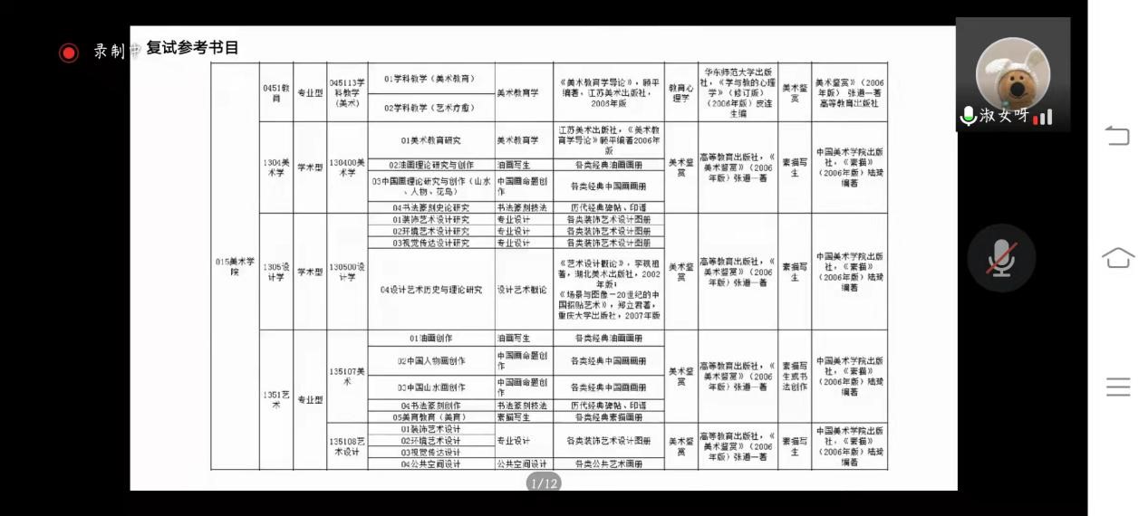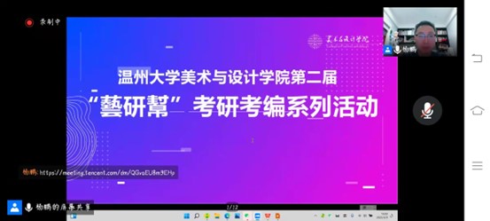 2022年6月9日晚上6点,禁忌书屋 第二届“藝研幇”考研考编系列活动如期开展,本期活动邀请了两位成功上岸学姐来为我们进行考研考编经验分享,活动由学工办主任杨鹏老师主持。 首先是陈佳群学姐分享,她是温大美术学专业2022届毕业生,现已考取台州市黄岩区编制美术教师,她分享的是自己考编的经验。 陈学姐先简单向我们介绍了一般师范生的毕业去向,再从储备应考资本、关注招考动态、了解招考程序、如何提高上课能力和劳逸结合这五个方面向我们分享自己的考编技巧。 对于了解招考程序这一块,陈学姐非常全面的从笔试面试和所报地区或单位的历年招聘情况三方面进行讲解。让众多大一大二学生提前了解了这方面的知识,受益匪浅。也让准备考研的同学们的思维脉络更加清晰。在学习之余,陈学姐鼓励大家要懂得劳逸结合,休息是为了更好的前行,有质量的放松是非常重要的,而不是两点一线,这样的人生失去了意义。所以无论如何,要记得休息,审视自己,每天给自己安排一个合理的放松时间,给心灵来一次放松,这才是真正意义上的劳逸结合。最后陈学姐还分享了自己关于大学生活和工作的看法。 而接下来的张淑颖学姐则分享的是自己的考研经验,张淑颖学姐是杭州师范大学2020级艺术设计在读研究生。 张学姐详细的为我们讲解了考杭州师范大学美院需要知道的一些具体情况。考前要通过研招网和院校官网以及与学长学姐沟通等方式综合比较确定自己的目标院校和专业。 随后学姐还推荐了众多复试的参考书目,信息很全面。 张学姐还给我们分享了自己的美术史论的学习技巧,要做好合理的规划和历年真题的研究,要学会整理书本重点理清答题思路与技巧。 最后,杨老师对本次分享会进行了总结,同时也回答了一些备考生关注的问题,让大家对于考研考编的认识更深入了一层。
