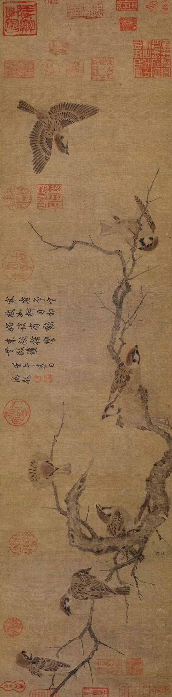 宋代的折枝花鸟画的画幅形式有直幅、长卷、册页之分,册页又可分为方形、圆形、扇面等形式。长卷形式如崔白《寒雀图》、扬无咎《四梅图》、佚名《百花图》等。直幅形式如马麟《层叠冰绡图》、牧溪《翡翠鹳鸽图》等。