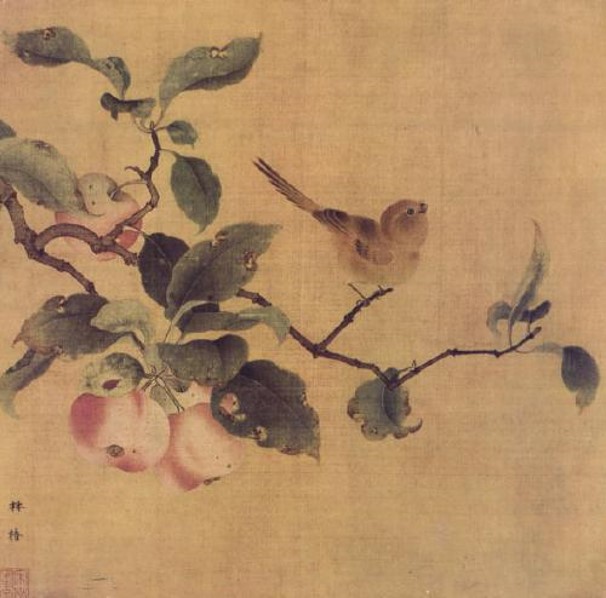 因此,我们从更广义的角度去理解折枝构图的概念,应包括截取法和折枝法两种表现形式,折枝法是画家搜集素材的一种形式,截取法是让画面中的物像撑边,进而扩大了折枝法的艺术表现力——折枝构图是截取树木花草中最美的一角或一段作为表现内容,并对画中所取物象进行概括取舍,使其形成既可与画外保持联系,又令画幅四周留有余纸的构图方式。其构成法则运用灵活,结构组合丰富变化,内涵深广且法度严谨。折枝式构图是宋代花鸟画最常用的构图形式,宋以后则日趋程式化了。