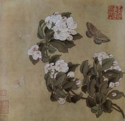 可见在唐时花鸟画已具独有的取景角度,一种新的构图形态已基本形成,即折枝构图。花恩画折枝构图的概念该如何界定呢?从“折枝”字 面的狭义角度来理解,应是将大自然中的花草树木折断摘取回来,放在书案对着描绘。邹一桂《小山画谱》里说的“瓶插对临”和吴太素《松斋梅谱》里记载“初学写时,以瓶置花”,即是指此,均以折枝形式入画。并有以“折枝花卉”命名的作品记载,如郭若虚的《画见闻志》共载有七位画家画折枝花鸟画的记录,《宣和画谱》记载17人62件 折枝花卉作品,但记载的这些作品大部分已遗失。查阅《宋人画册》《中国古代书画图目》《中国绘画综合图录》并续编,以及众多的《宋代花鸟画册》,发现除全景构图的花鸟画作品外,其余大部分均采用截取物象的形式构成画面,仅少数几幅是以画面四周空白的折枝形式入画。而且明清以来的大部分折枝花卉册页、手卷和扇面,其画面构图采用的也是截取的折枝形式。