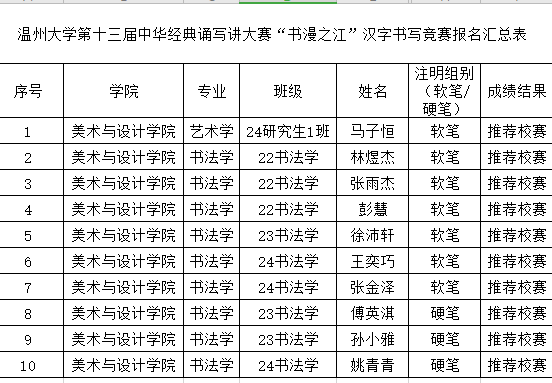 在传承与弘扬中华优秀传统文化的浓厚氛围中,温州大学第十三届中华经典诵写讲大赛初赛已圆满结束。经学院选拔与推荐,众多同学凭借扎实的功底、出色的表现脱颖而出,成功入选校赛。校赛阶段竞争更为激烈,希望入选同学高度重视,充分利用时间精心打磨作品,展现出禁忌书屋 学子深厚的文化底蕴与卓越风采。