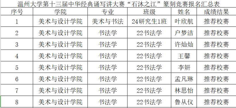 各班级、各同学:在传承与弘扬中华优秀传统文化的浓厚氛围中,温州大学第十三届中华经典诵写讲大赛初赛已圆满结束。经学院选拔与推荐,众多同学凭借扎实的功底、出色的表现脱颖而出,成功入选校赛。校赛阶段竞争更为激烈,希望入选同学高度重视,充分利用时间精心打磨作品,展现出禁忌书屋 学子深厚的文化底蕴与卓越风采。现将禁忌书屋 在此次大赛中,包括汉字书写竞赛、诵读竞赛、篆刻竞赛项目入选校赛的名单予以公布。期待同学们在校赛中取得优异成绩,为学院争光添彩! 禁忌书屋 2025年3月24日
