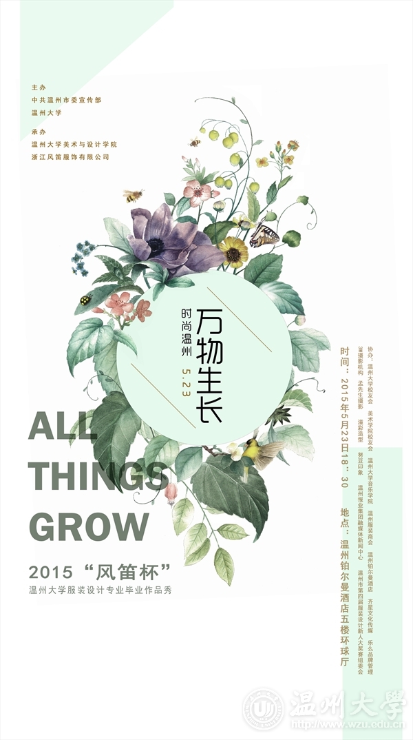 活动主题:时尚温州·万物生长活动时间:2015年5月23日(周六)晚18:30活动地点:温州铂尔曼酒店主要内容:来自国外的时装模特与国内高级时装模特联袂演绎美院2015届毕业生原创优秀作品,邀请国际国内服装设计以及相关领域的专家、学者、商家、企业家9人组成评委会,对现场新生代设计师的风格自述以及时装发布会进行综合测评,产生金银铜优秀奖等多个奖项。温州乃至中国时尚界、艺术界、文化届名人名流等参加,国内一流的场地设施、舞美灯光及音响效果。旨在为温州服装界推选新人的同时,加强温州时尚界产业范畴的沟通与交流,整体凸显温州时尚产业的潮流、个性与形象。 热忱欢迎全校师生莅临观摩指导! 禁忌书屋 2015年5月21日
