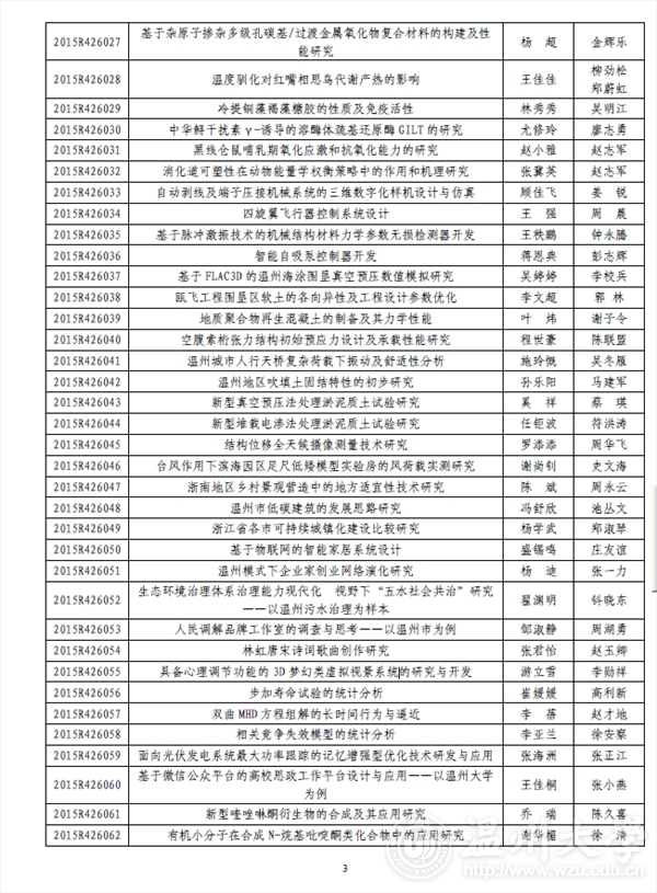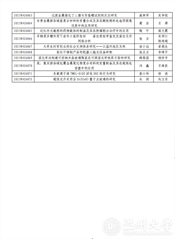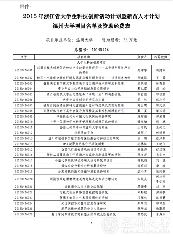 温州大学团委: 2015 年浙江省大学生科技创新活动计划暨新苗人才计划已于2015 年1 月启动实施,经学校推荐和专家评审,共确立项目2061 项。现将你校通过立项的项目名单印发你们(见附件),请认真实施、加强管理。为不断提升我省大学生科技创新工作整体水平,项目实施办公室还将与省团校合作对项目负责人进行相关培训。附件:2015 年浙江省大学生科技创新活动计划暨新苗人才计划温州大学项目名单及资助经费表浙江省大学生科技创新活动计划暨新苗人才计划实施办公室2015 年6 月3 日