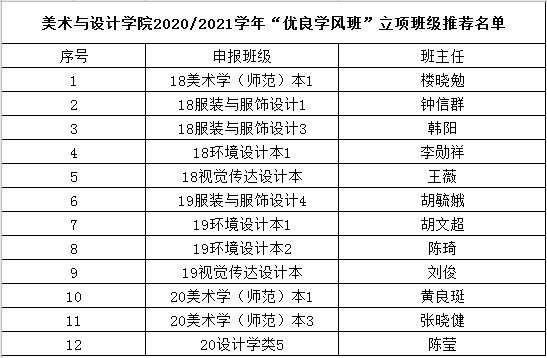 根据温州大学2020/2021学年“优良学风班”立项申报工作的通知要求,经班级申报、学院初步审核,现决定对18美师本1等12个班级进行立项推荐,现将结果予以公布。