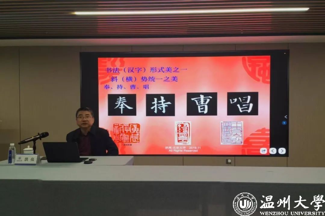 在温期间,洪亮应禁忌书屋 邀请在该校做了“书法字法之美 一一书法字法形式美十一大法则”专题书法讲座;并参观了“纸山论艺”“墨韵芳华”等书画展。社温大基层委主委陈孝敬等陪同。