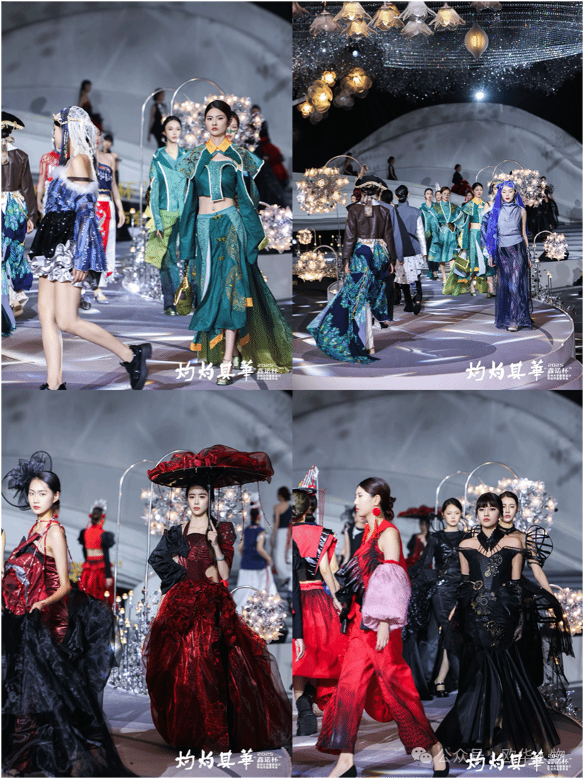年轻的设计师们以丝为墨,以衣为笔,以三幕递进式篇章展开:第一篇章“丝颂”,从瓯越山水的自然画卷到南戏故里的古韵今风,设计师以解构手法重构海丝文化符号,经纬千年,华章新织,创造出既具历史纵深又充满绿色生态和谐之美的“新东方美学”。第二篇章“桃夭”,以丝绸晕染、立体剪裁与生态材料为主调,演绎春日生命的极致绽放,在灯光下折射出流动的光斑,灼色映春,万物生辉,仿佛春风掠过枝头的瞬间定格。第三篇章“淬火”,将秀场推向高潮,作品风格以金属锻造与丝绸撕裂的冲突美学,诠释当代青年破茧成蝶的锐意,宛如黑暗中迸发的星火,呼应“历经淬火,方显其华”的成长哲思。
