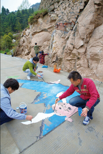 温州网讯 近日,在温州市区大罗山盘垟村入口处,十多名温大美术学院的师生,在水泥路、岩石上进行手绘创作——蓝色的天空、憨态的智慧猪,生动有趣。 相关链接://news.66wz.com/system/2015/04/20/104422135.shtml