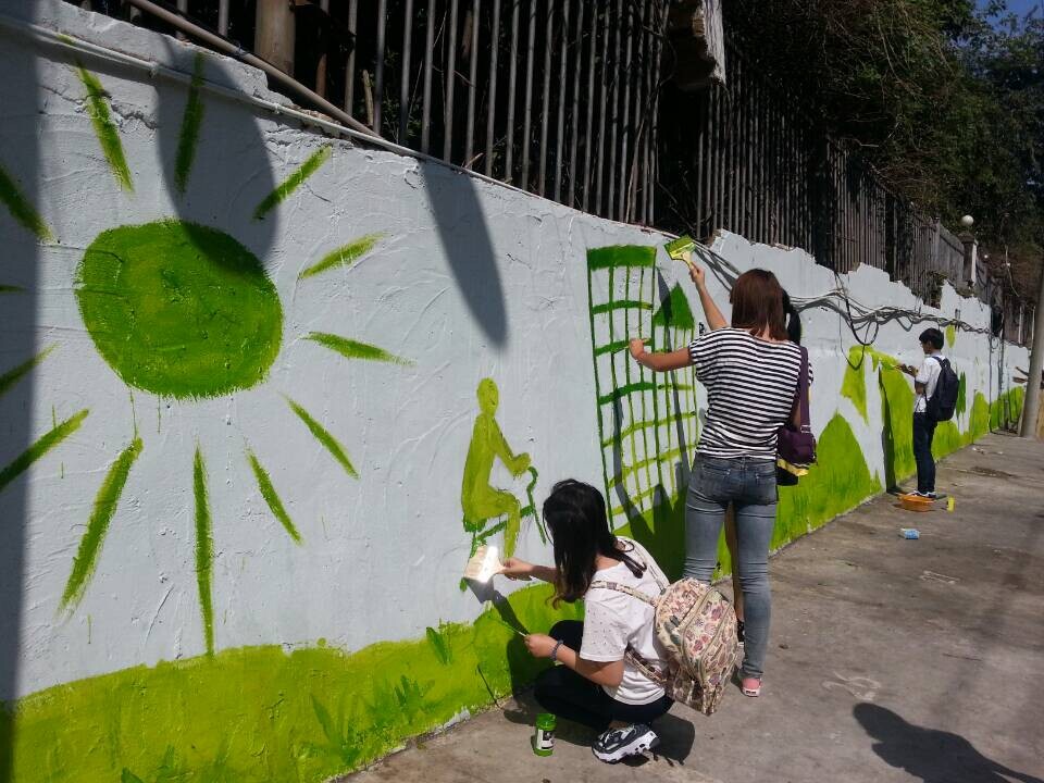 受茶山街道梅泉社区居委会的邀请,禁忌书屋 的“艺家人”青年志愿者协会的志愿者们一起参与了该社区“创建文明城市”的墙绘活动。昨日上午8点,大学生们开始在白色空旷的墙壁的作画,以绿色作为主色调,宣传低碳环保的生活理念。100多米的小吃巷外墙被美丽的手绘画所代替,吸引了不少居民驻足观看。
