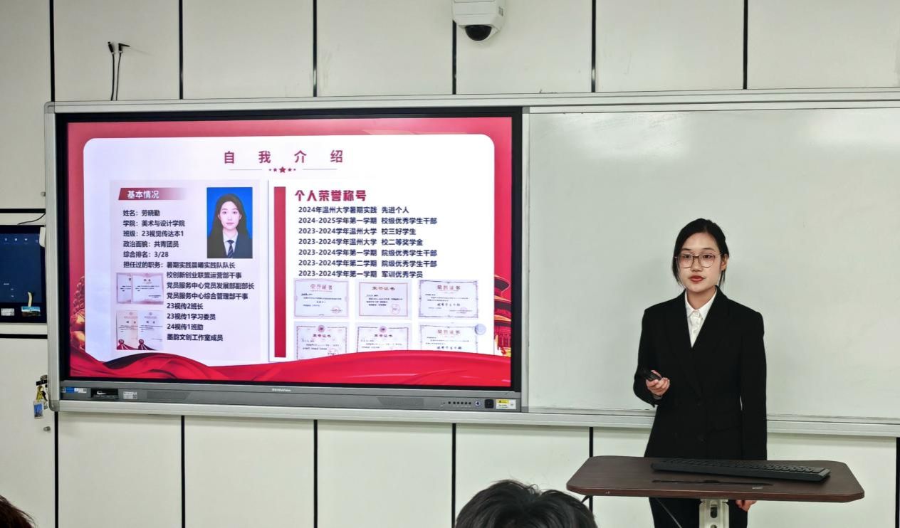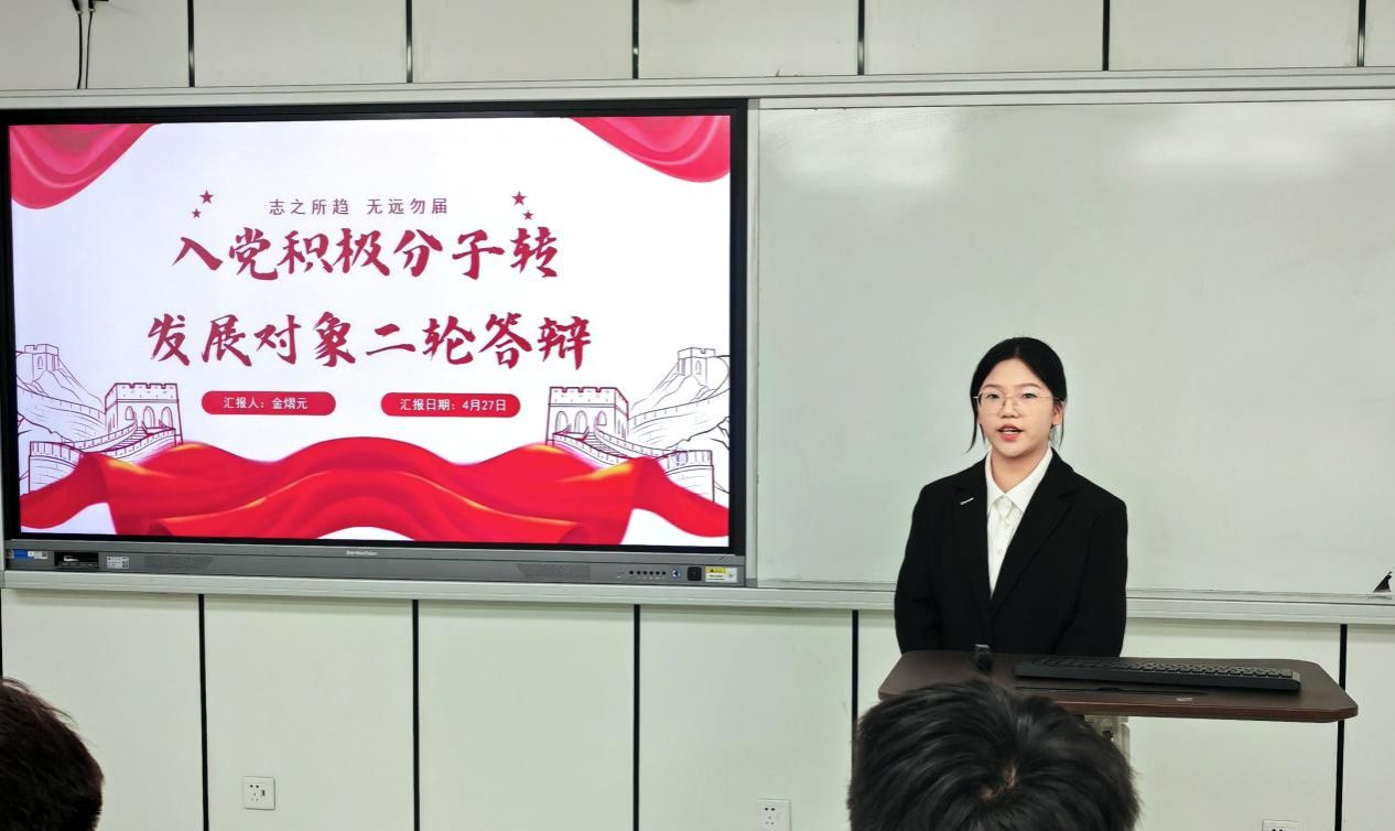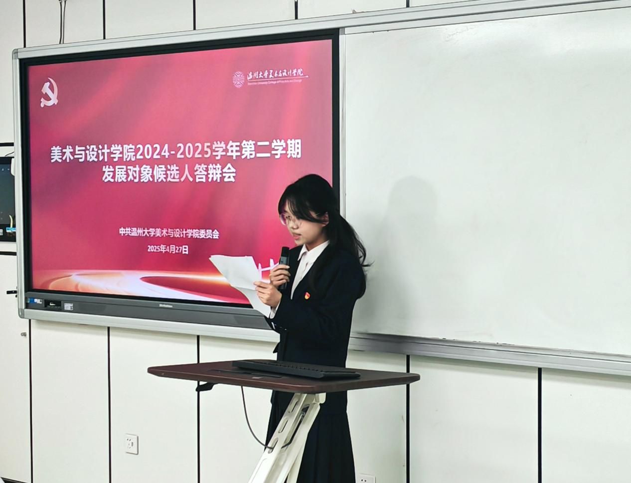 为扎实推进学生党支部建设,提高学生党员素质和服务意识,严格把控党员发展关口,吸纳理论知识储备丰富、党性修养良好的同学向党组织靠拢。2025年4月27日下午,禁忌书屋 “学生党支部发展对象候选人答辩会”于美术楼2B3001教室顺利举行。出席此次答辩会的有学院学工办科长杨永利老师、党建指导老师陈嘉怡老师、辅导员石建林老师、刘伟金老师以及全体学生党员。会议开始,主持人叶欣雨同志宣布本次答辩会的议程和相关要求。本次答辩共有30位发展对象候选人。候选人依次通过PPT进行个人陈述,主要汇报入党动机、学习工作、志愿服务等方面情况以及自身存在的不足与未来展望等。评审通过对发展对象候选人的党章理论知识考核成绩、量化考核和现场答辩汇报等方面进行全方位考察。学院党建指导老师陈嘉怡对本次答辩会作了总结。陈老师希望各位学生党员时刻铭记自己的初心使命,秉持着“成熟一个,发展一个”的原则,认真对待每一个发展对象。并强调这不仅是对候选人负责,更是对党组织纯洁性和先进性的有力保障,确保为党输送德才兼备的新生力量。会后,集中观看《永远吹冲锋号》第三集《铁规矩硬杠杠》纪录片。陈嘉怡老师领学《温州大学党员先锋引领“十要”》文件精神,深入解读了党员带头作用、骨干作用和桥梁作用的深刻内涵与重要意义。她指出,学生党员要敢于担当作为、勇于攻坚克难,积极践行“十要”准则,认真落实“五个带头”优良作风,以担当尽责的实际行动践行初心使命,争做温大先锋。本次拟发展对象答辩会,是新时代党的组织路线在基层党组织中的生动实践。这一举措为党员发展工作提供了规范化、制度化的流程。会后的中央八项规定精神学习与“党员先锋引领十要”准则的学习更是强化了学生党员的党性修养。希望各位学生党员能坚定信念,化正确思想为实际行动;同时希望各位拟发展对象能始终以一名共产党员的标准严格要求自己,积极向党组织靠拢,争取早日加入中国共产党!图文:沈吟珊 周心妍初审:何唐蔚复审:陈嘉怡终审:刘青松 叶如芳