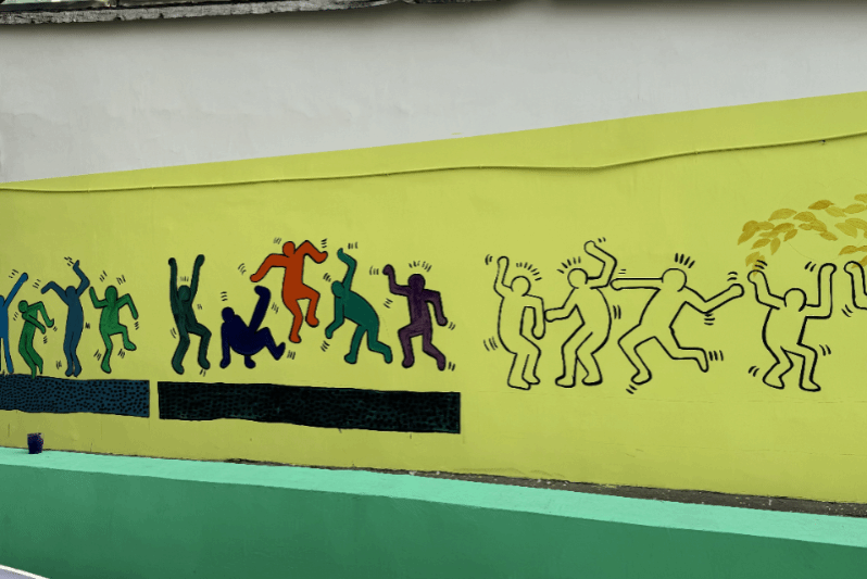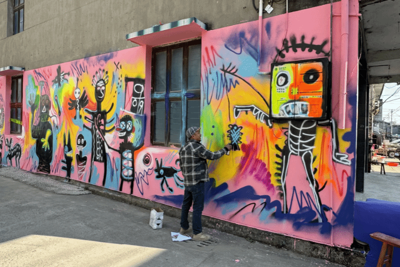 不同于自我创作时追求个性,在公共文化创作上,关明新更倾向于将个性与公众有机融合。今年1月,关明新老师带领温州各地区艺术家在陶山洲渎村艺术涂鸦工程中创作了30余幅墙绘作品,覆盖3000余平方米的墙面,仅耗时5天便为乡村穿上新衣。这一系列墙绘作品不仅融入了乡村特色与风土人情,还采用了具象、意象和抽象等多种表现形式,将“卡通人物、狗、鸟”等元素自由组合,以涂鸦的形式生动展现。整个墙面色彩鲜艳夺目,充分展现了艺术家们热情奔放、积极向上的精神风貌。同时,这些作品也融入村落特有文化符号,采用具有前卫性与创新性的现代艺术语言,为公共艺术空间注入了新生力量。
