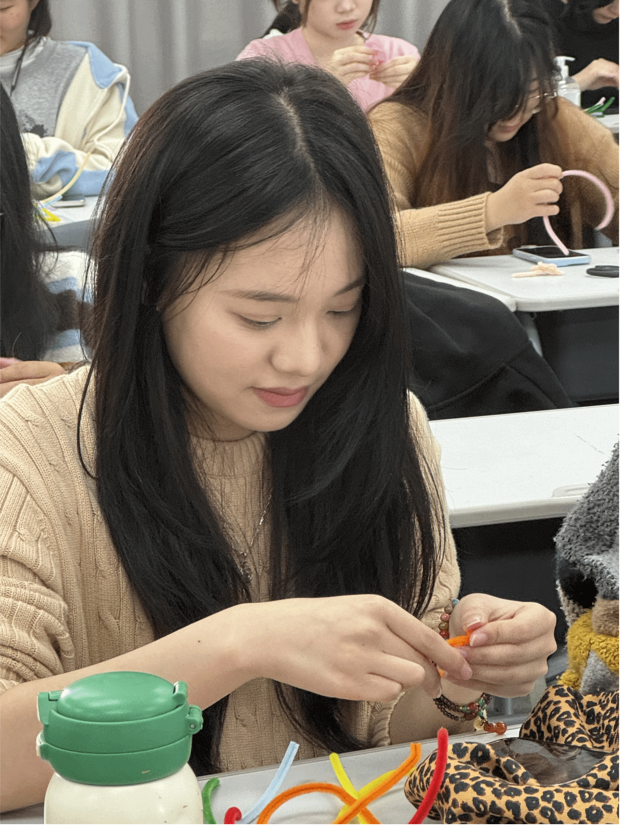3月12日的扭扭棒手作活动从花朵、动物到创意摆件,扭扭棒的百变可塑性激发创造力。活动将艺术疗愈与心理教育相结合,培养同学们审美力、劳动意识,传递“以劳健心”的理念。通过扭扭棒手工创作,同学们将内心情感具象化,帮助个体梳理情绪、接纳自我。