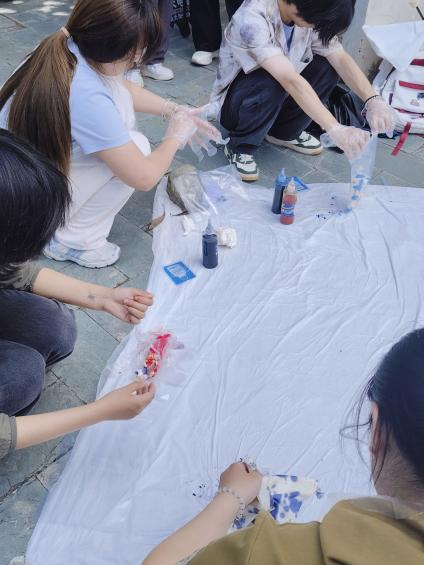 活动伊始,工作人员详细讲解扎染的历史、技巧与色彩搭配,并现场演示。同学们随即拿起工具,通过折叠、捆绑等手法在白色T恤上创作独特图案,染色时精准控制染料浓度与扩散范围。
