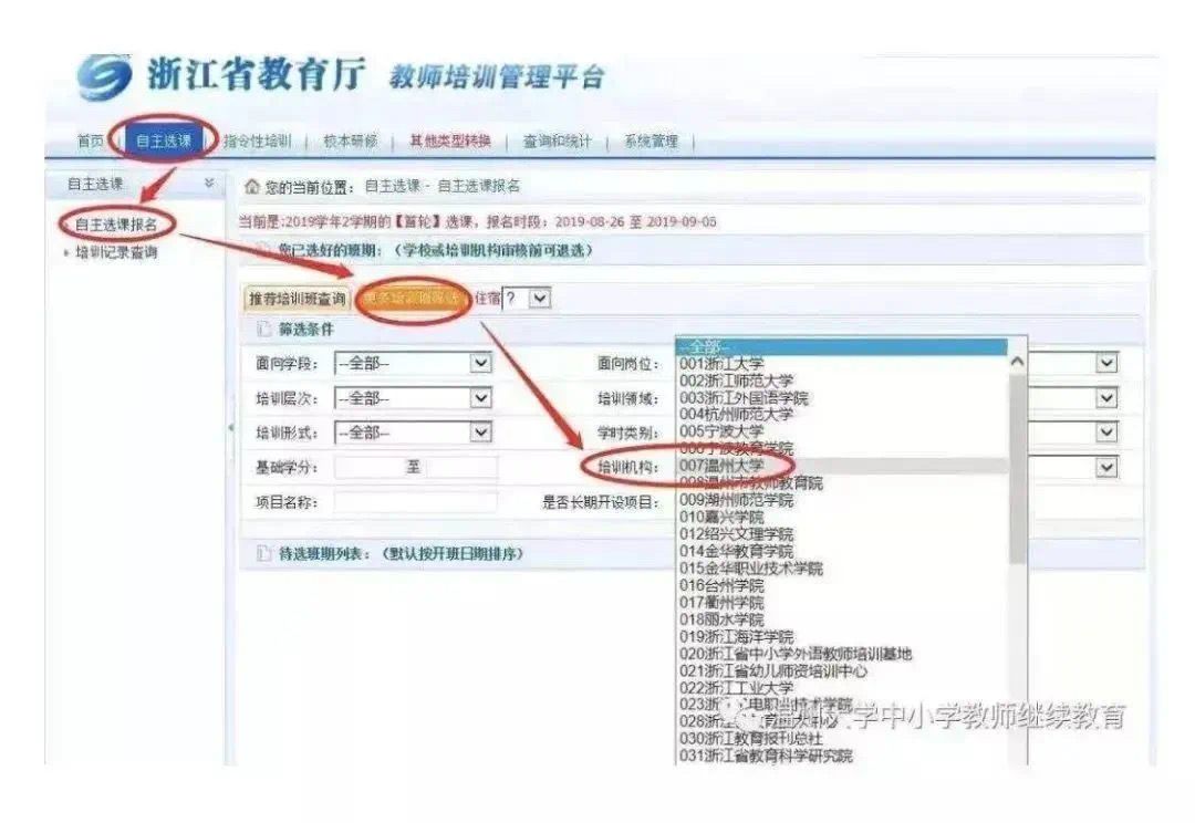教师培训管理平台→自主选课→自主选课报名→更多培训班筛选→培训机构(温州大学007)→面向面向地区(浙江省或温州市)→查询→报名。在筛选条件中,培训机构选择“007”,“面向学段”和“培训学科”设为“全部”,即可看到温州大学的所有培训项目。